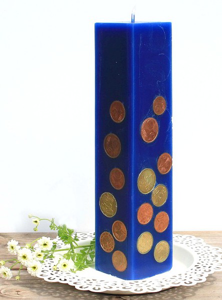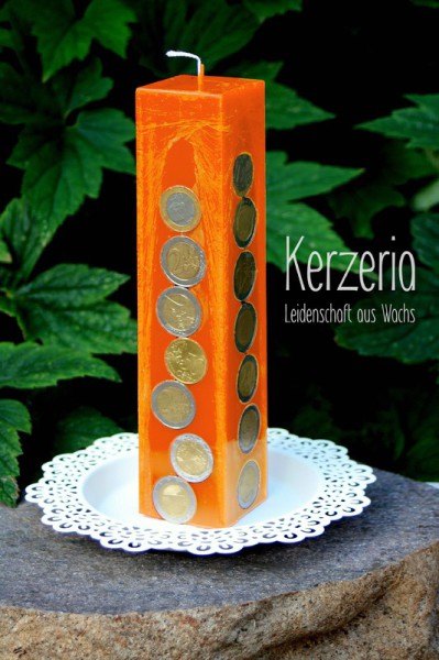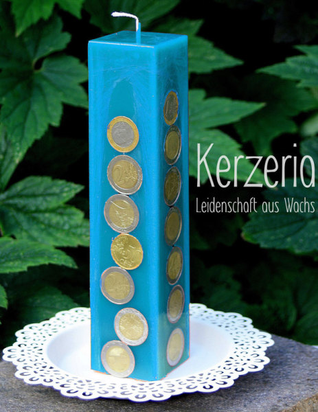 Das perfekte Geldgeschenk: Die in der Geldkerze eingearbeiteten Münzen funkeln und glitzern direkt an der Oberfläche.