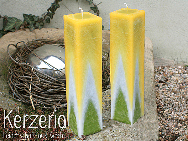 Ein Traum in sonnigem Gelb, Weiß und Grün sind diese ganz besonderen Kerzen, die mit jedem Leuchten schöner werden, denn sie blühen auf. Genau das Richtige für einen heiteren Anlass wie eine